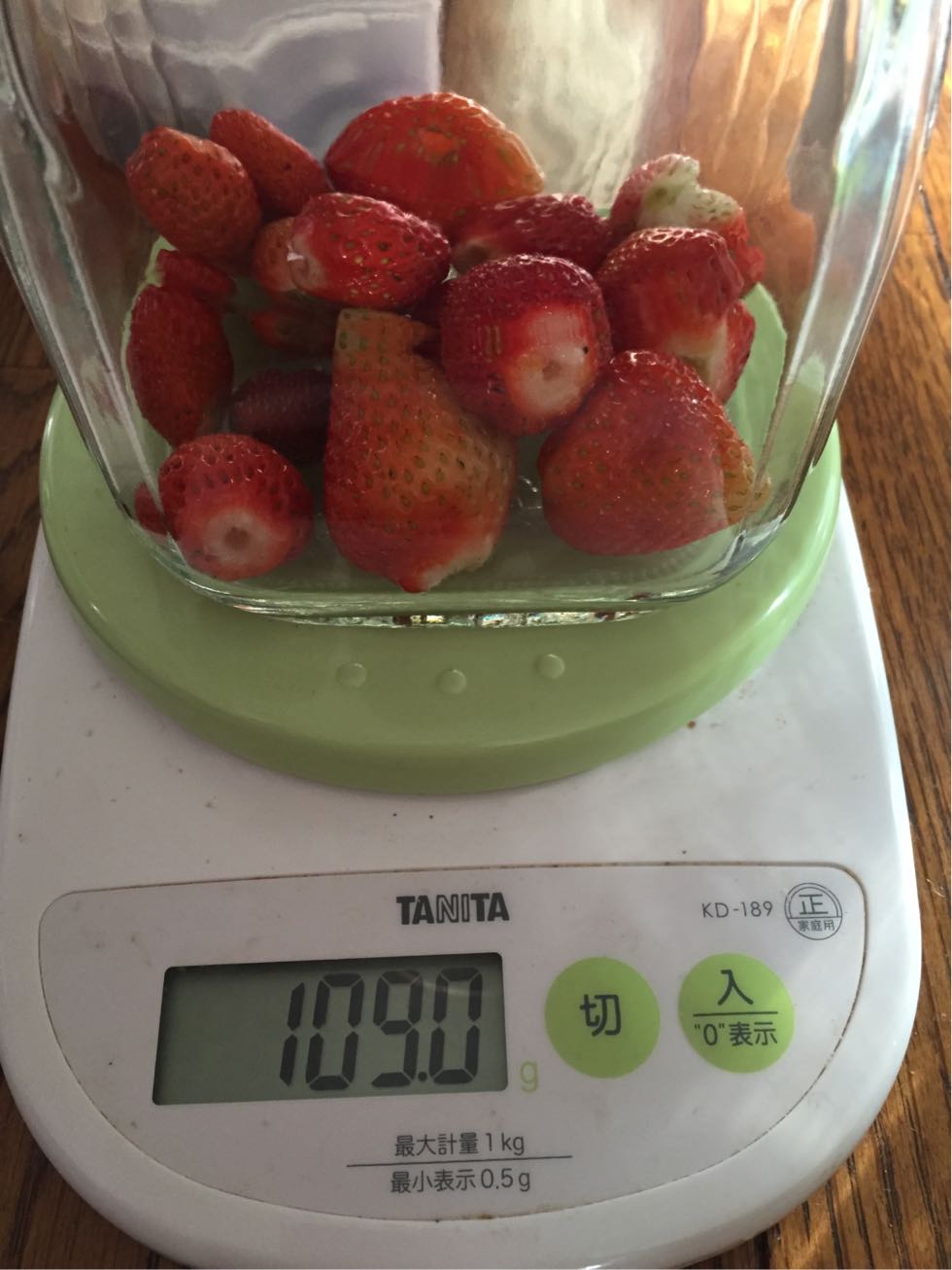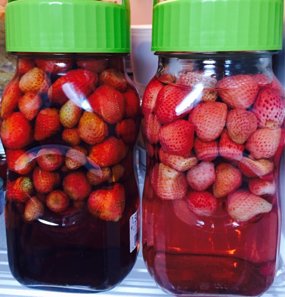 いちご酒 果実酒 2015年05月20日 梅まで待てず果実酒熱が上がってしまい...いちご酒始めました。(春の季語)畑にいちごを植えていて、ちゃんと手入れをしていないからカオスな野生のいちごみたいになっているので、一度に綺麗には採れません。採っては漬け採っては漬け、最終的に氷砂糖を足す感じになるかな?とりあえず、ホワイトリカーに漬けてます。時期的に雑味が出やすいらしいので冷蔵庫へ。楽しみー!5/26追記畑のいちごを収穫してリカーに漬け...を繰り返し、漬け終わりました。冷蔵庫でいちごの色が抜けるまで、1ヶ月ほど漬けます。ホワイトリカー(右)(いちご500g、氷砂糖100g、リカー800ml、1.5lビン)サントリーVOブランデー(左)(上記同様)冷蔵庫の中からこんばんはー!!5日間で少し赤くなってる。綺麗♡なんてやってたら、畑のいちごが本気出してきて、急遽シロップも。1ヶ月後までいちごが収穫できれば追い漬けしてみたかったんだけど、無理だろうな。このままうまくいきますように...!追記5/31いちごシロップをいちご豆乳にして味見。すっっっごいおいしい!!ジップロックでも作れると聞き、追加でまた作ってます♡