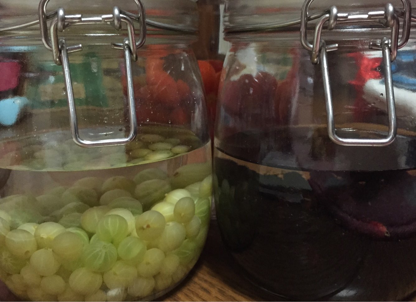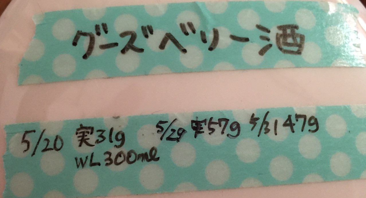 ぐみ酒、グーズベリー酒、桑の実酒 果実酒 2015年05月31日 摘んでは漬けの繰り返し。ぐみ酒(1.5Lビン)ぐみの実500g、氷砂糖100g、ホワイトリカー800mlん?中間に浮いてる?ぐみは傷んだものや、まだ真っ赤になりきってないものを漬けてしまった。グーズベリー酒(0.75Lビン)グーズベリー300g、氷砂糖50g、ホワイトリカー500mlまだ足りない...。桑の実酒(0.75Lビン)桑の実300g、氷砂糖50g、ホワイトリカー500mlこっちもまだ半分くらいしか採れてない。まだまだたくさん採れそうなので、桑の実の利用法も検討中。あー楽しい♡