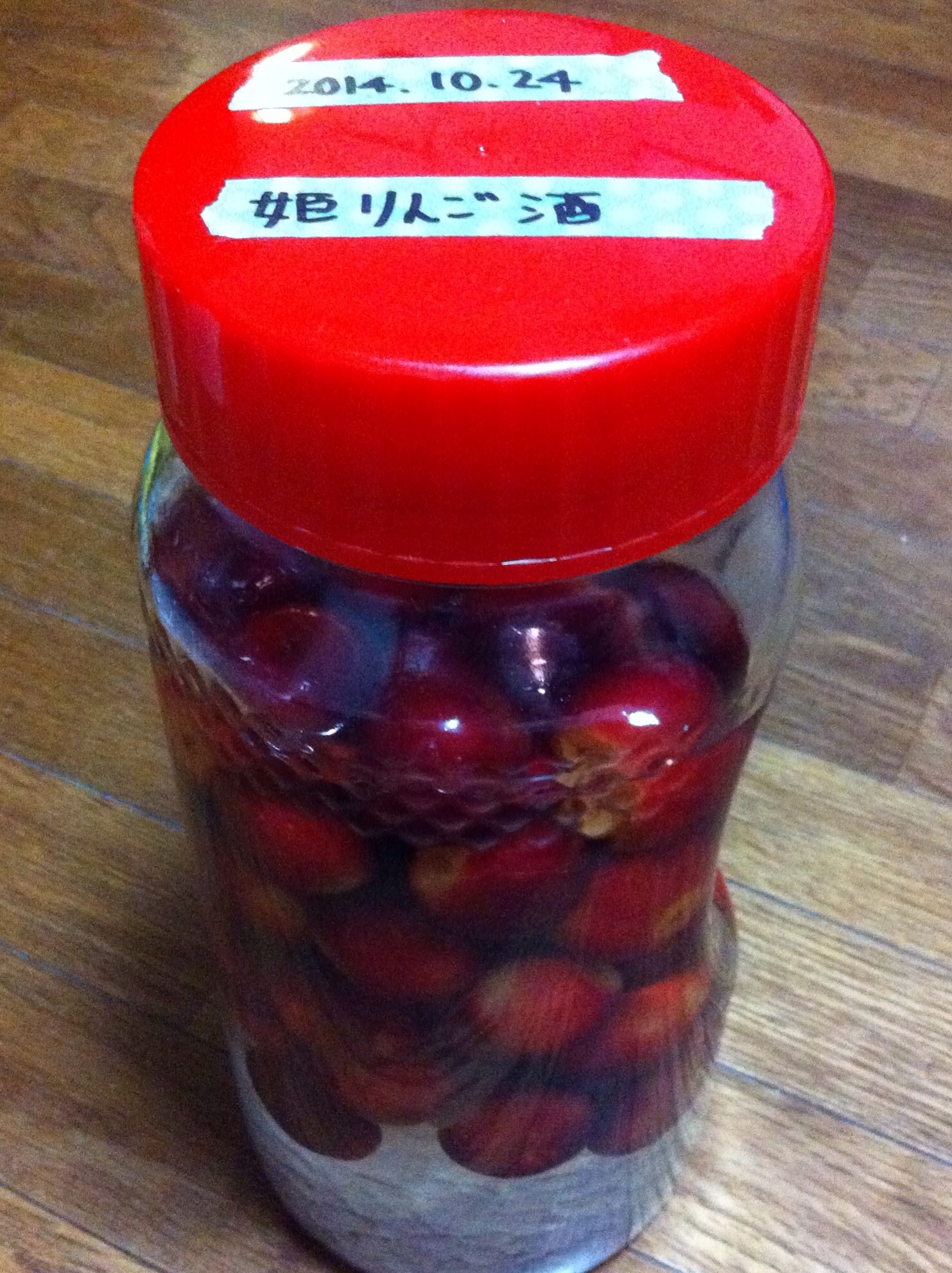 姫リンゴ酒 果実酒 2014年10月25日 姫リンゴ酒を仕込みました。レシピは適量です。姫リンゴが酸っぱすぎるので、氷砂糖多めで。上下を切りました。姫リンゴ800g氷砂糖500gホワイトリカー適量 かわいいなー。